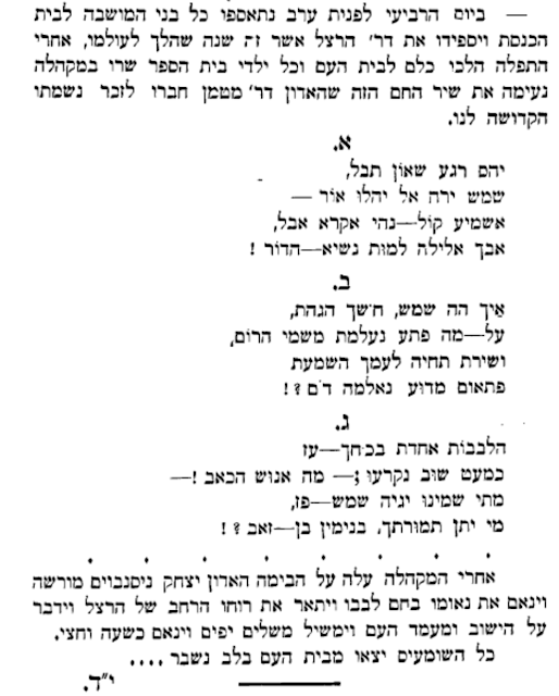 הרצל שרה מקהלת בית הספר את שירו זה בבית הכנסת של המושבה. בעצרת הזיכרון הזו השתתף גם הרב יצחק ניסנבוים מוורשה, שביקר אז בארץ. ניסנבוים היה מראשי