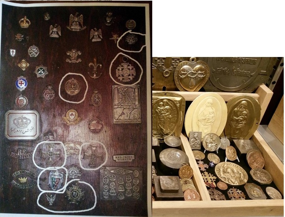 תחילה סברתי שזהו לוח תצוגה של סמלי צבאות זרים שיובאו מחו"ל כדי למכור אותם לחיילים ששהו כאן. אבל בהמשך נמצאו השטאנצים והצלחתי לשחזר את כל שלבי הייצור – כולם יוצרו בבית המלאכה הקטן של ש' קרצ'מר ובניו. נמצא כאן, בין השאר, את אבזם החגורה של עבדאללה ההאשמי, המלך הראשון של ירדן, וכן סמלי ממשלת המנדט וצבאות זרים שלחמו עם הבריטים ועברו כאן. כזה למשל הוא סיפורו של צבא אנדרס הפולני, שנחשף בזכות קשר שנוצר עם חייל פולני ישיש שסיפר לי כיצד נסע מבסיס צבא פולין החופשית בבית ג'וברין לכיכר ציון כדי להזמין מקרצ'מר סמלים לצבא הפולני (בצד שמאל, מוקפים בעיגול).